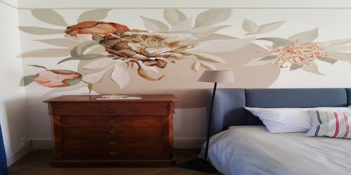 This bright bedroom is located on the first floor and is accessible only by stairs. The room size is 24m2 with its private toilets and bathroom equipped with a large Italian shower. There are two original murals painted by Anne, the lady of the house.